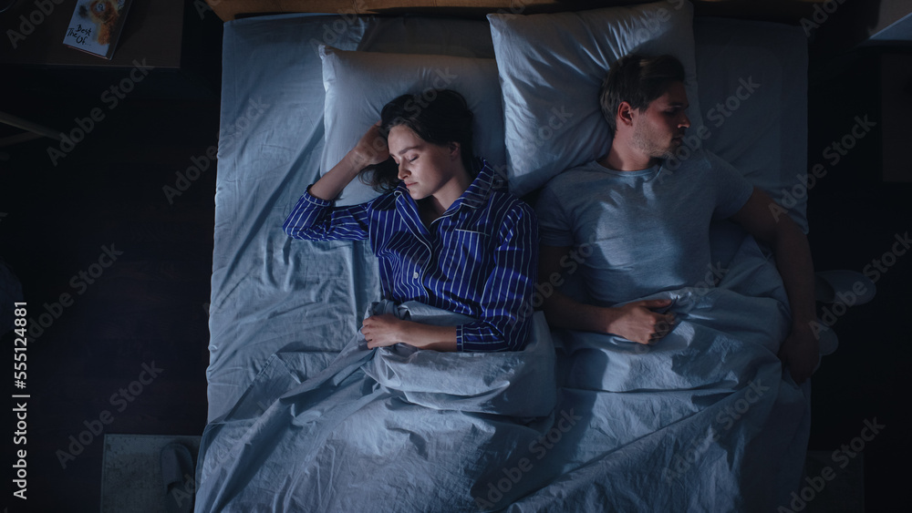 Top view of beautiful young couple sleeping together and embracing in bed at home Stock Photo from dissolve.com